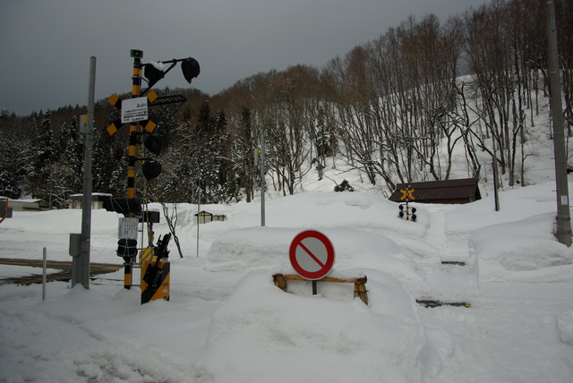 駅前商店街がだいぶ寂しい雰囲気。かつては活気にあふれていた時期もあっただろう。駅のそばの踏切が、雪のため通行止めになっていた。雪国にとってみては当たり前なんだけどね。
