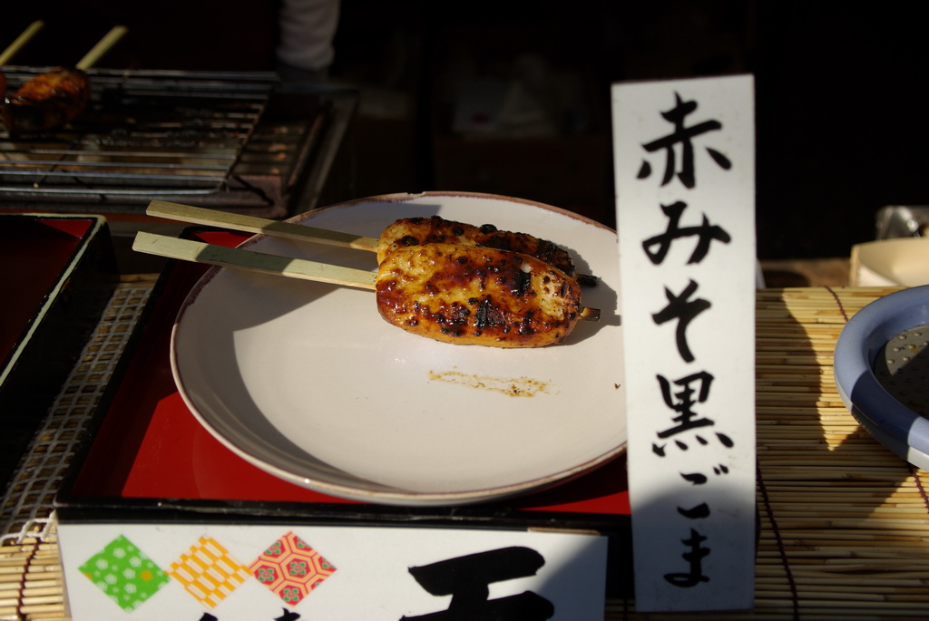 最後は小腹が空いたので、五平餅を食べました。店頭に用意された腰掛けに座って食べていたので、他のお客さんの広告塔になってしまったような感じでした。