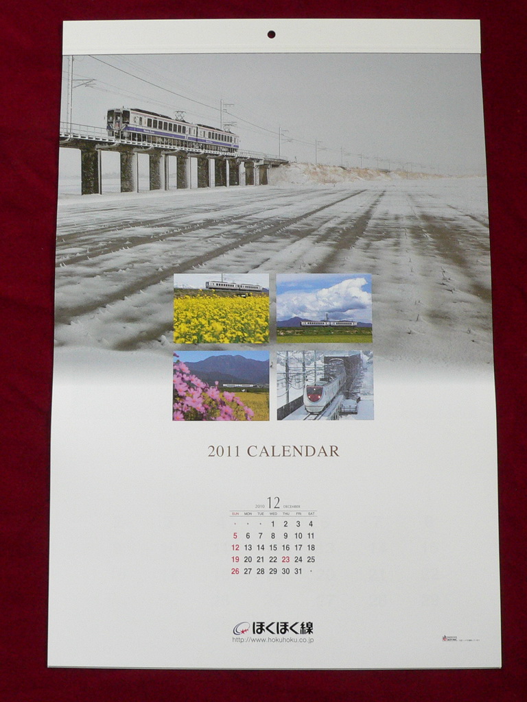 北越急行株式会社、いわゆるほくほく線のカレンダーです。中身は沿線の春夏秋冬の景色をバックに保有車輌が疾走するシーンとなっています。なかなか良いカレンダーです。部屋に飾って1年間楽しむことにしましょう。