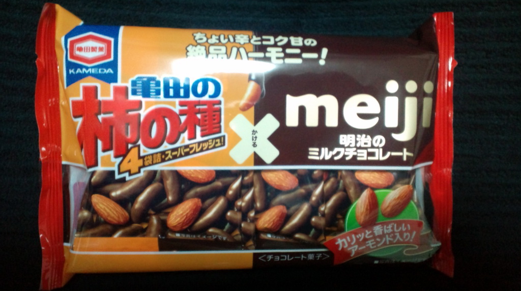 柿の種と言ったら柿の種の形をしたピリ辛の小粒あられとピーナツの組み合わせだけど、これはミルクチョコレートコーティングのピリ辛小粒あられとアーモンドとの組み合わせという、異色の組み合わせ。