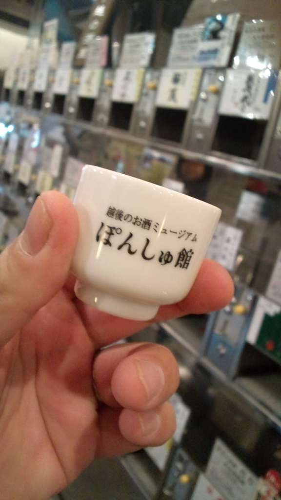 ぽんしゅ館 待望の酒ですよ。しかも大好きな日本酒。今日はもう車の運転をしなくて済むので、好きなだけ飲んじゃうよ♪ということで、利き酒コーナーへ。500円で5銘柄の新潟の銘酒を味わうことが出来ます。何はともあれ、早く飲みたい。最初の1杯は緑川にしてみた。