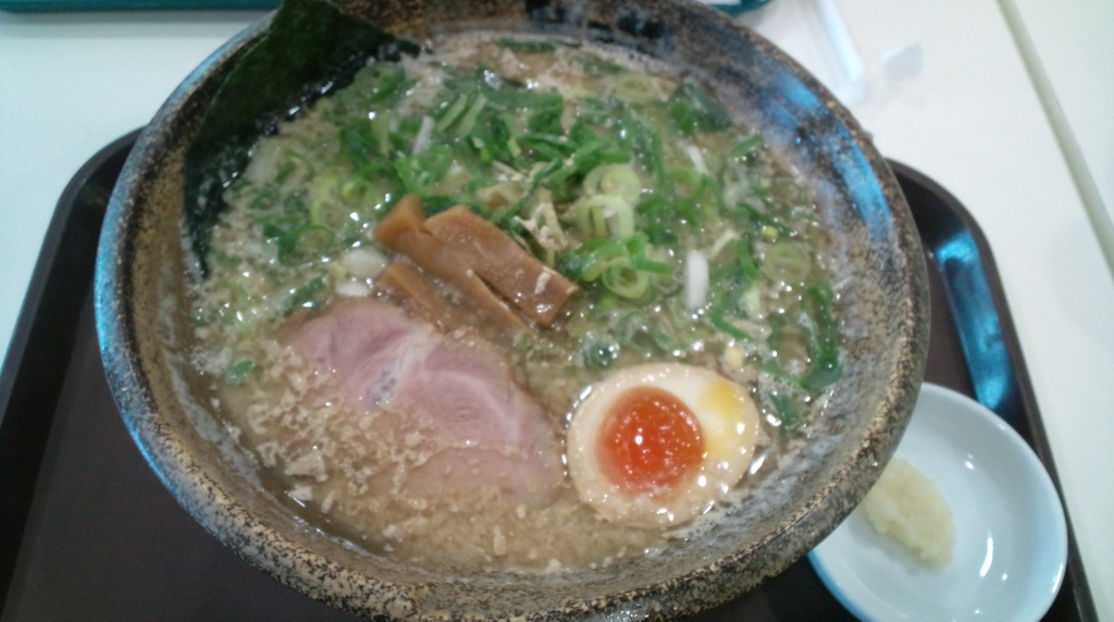 豚骨ネギラーメン大盛りをオーダー。更にパンチが欲しかったので、無料のおろしニンニクも追加オーダー。