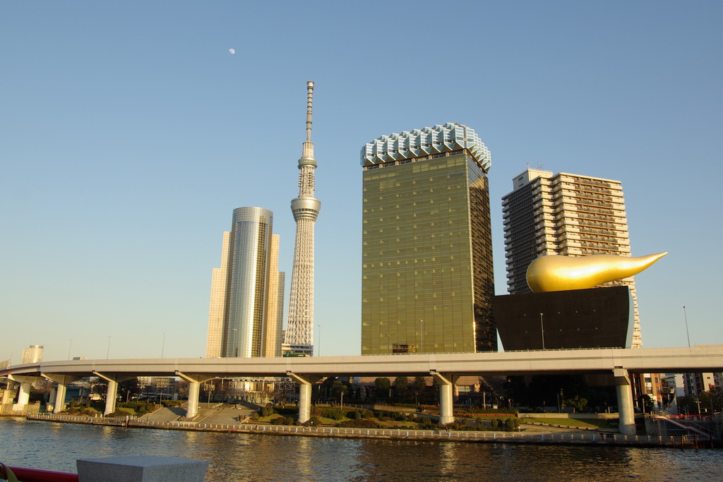 浅草駅を後にし、駅前の吾妻橋からスカイツリーを眺める事に。さすが国際観光地の浅草、国籍を問わずいろんな国々人たちがいる。そして忘れてならないのが、吾妻橋を渡った先にある金色のアレ。世に初めてお目見えした時は、誰もが