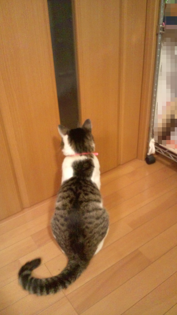 リビング出入り口扉のガラスをジーッと見つめています。扉の向こうの何かを見ているのかな?なんだか独りぼっちで黄昏れているようにも見えます。