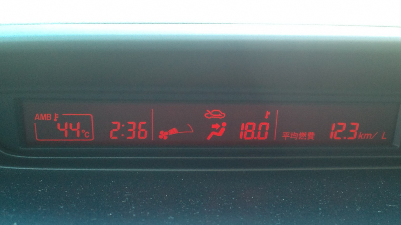 外気温が摂氏44度に!まぁ、ここに出る数値は当てにならないので気にしないけれど、もうこんな気温になっちゃうんだねー。結構長い時間駐車するので後の事を考えて日陰を見つけたのにですよ。直射日光下だったら末恐ろしい数値に!