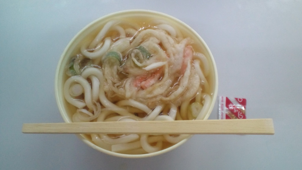 で、肝心のうどんなんですが、先ほどのものとはまた違って、かき揚げの大きさこそ小さいけれど、なんだか上品なつゆの味付けに感じます。麺のコシもクタクタになる手前で、おなかに優しい感じです。