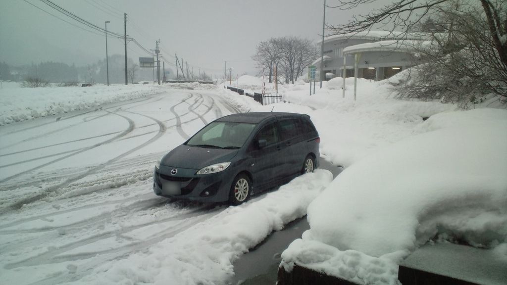 ところがここで危機一髪のハプニングが発生!駐車場へ戻ろうと先ほどの横断歩道を渡っていると、俺の前をプリウスが右から猛スピード(雪道なので多分30~40km/hかな)走り去った!思わず