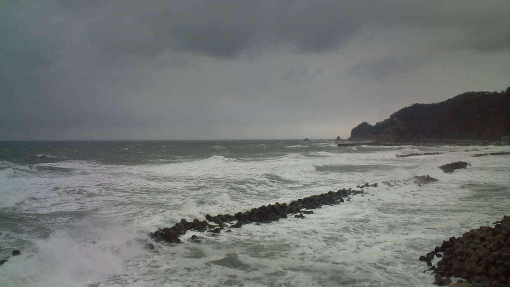 勝木駅近くの交差点を左折し、山側を走るR7からR345へ。冬の日本海沿岸ルートだ。消波ブロックに押し寄せる波が砕け、路面に乳白色の波の花がフワフワ踊る。一見情緒溢れる風景だけど、俺の心の中は、