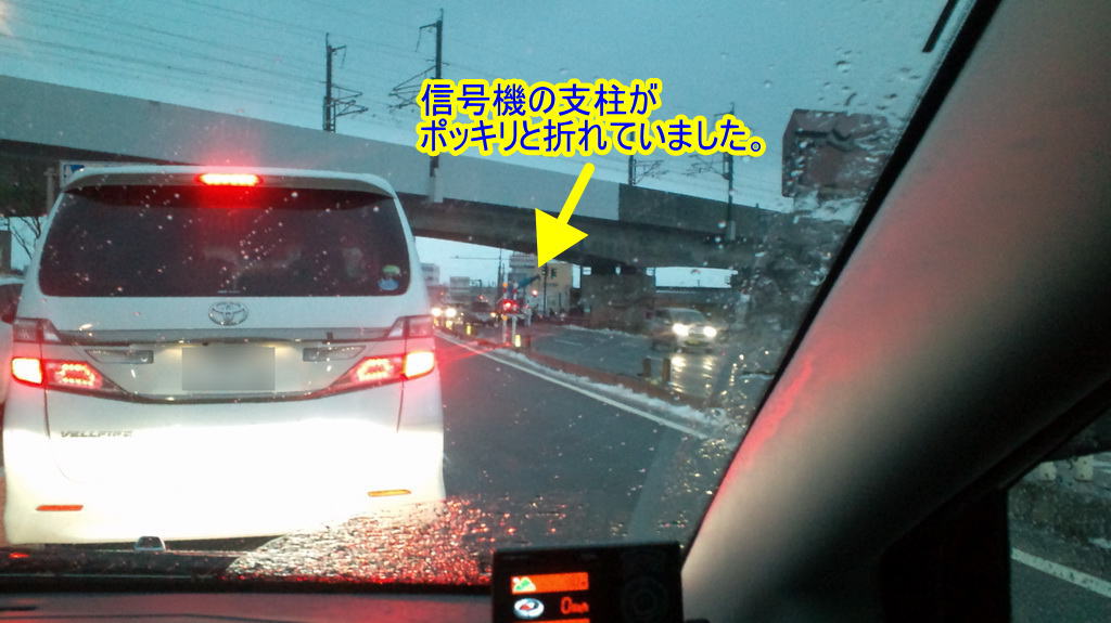 R7を新潟市方面へ向かい、そのままR8に入って自宅へ戻ろうとすると、大事故が発生!今日はあまりにも風が強かったので、信号機の支柱がポキッと折れてしまったのである。