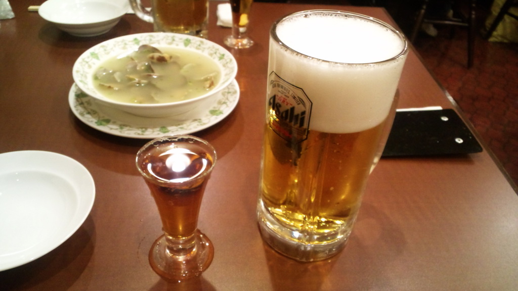 再会を祝して、乾杯! 焼けるようなデンキブランの刺激が喉を通ってゆく。炎上する食道を鎮めるかの如く、生ビールをグビッと。