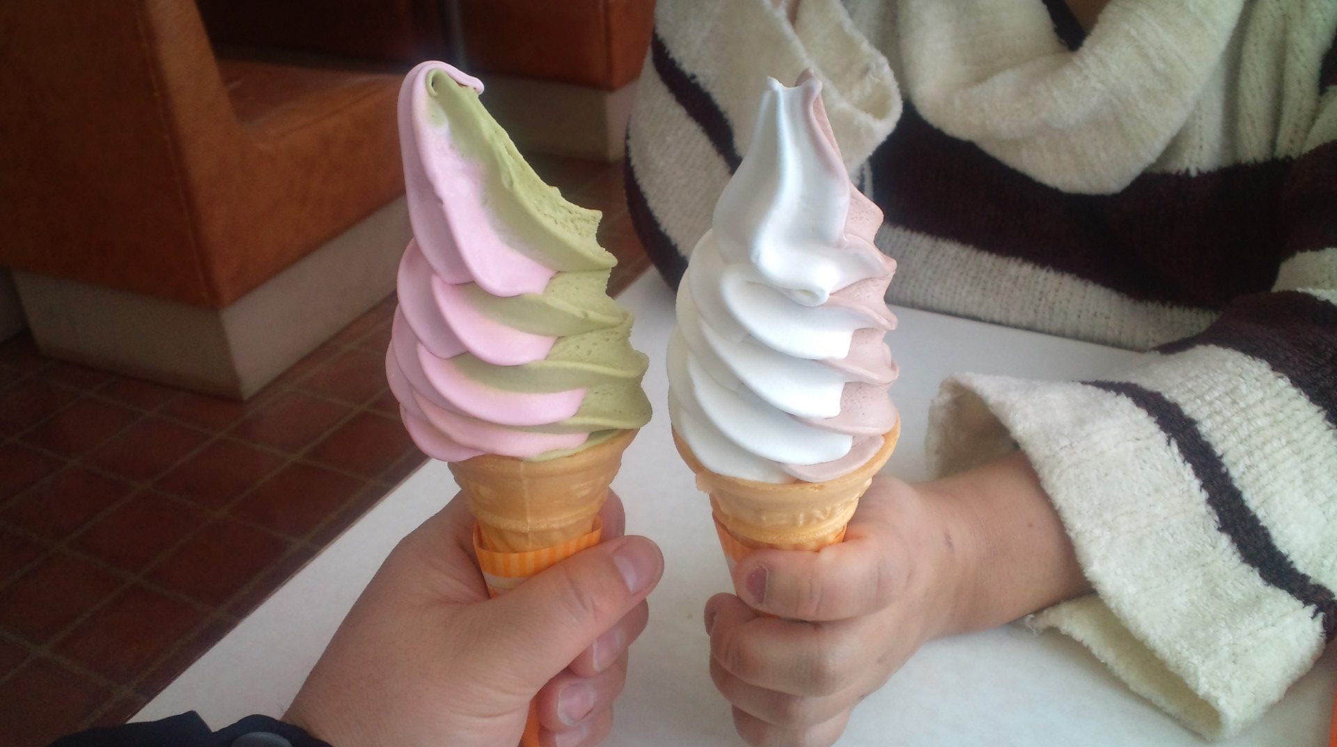 ソフトクリームなのだ!イタリアンを食べた後は、ソフトクリームを食べるというのが定番。俺のは抹茶&ストロベリーで、嫁のはバニラ&チョコ。