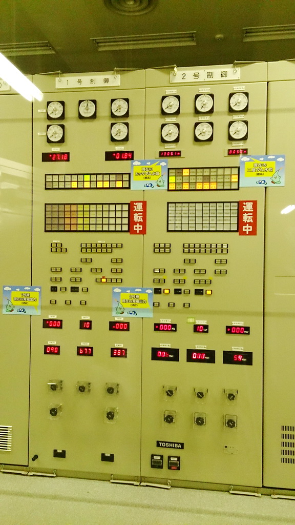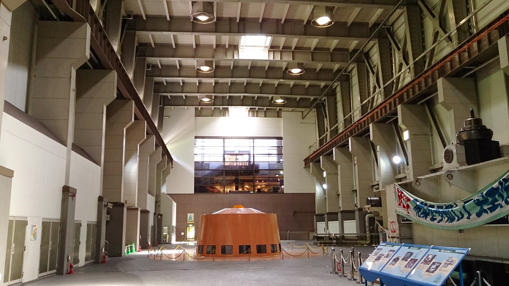 建屋内に入ると、すぐに発電機ユニットの一部が見える部屋が一望できる。ここは入口だけの地上3階なので、一つ階下の2階で受付を済ませる。居住市町村と見学人数を記入するだけだ。さらに1つ下の1階に進む。