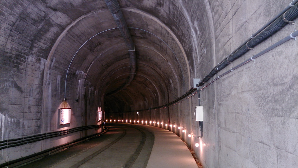 壁に沿って光っているのは工事用の照明なんだけど、なんかファンタジーな雰囲気。