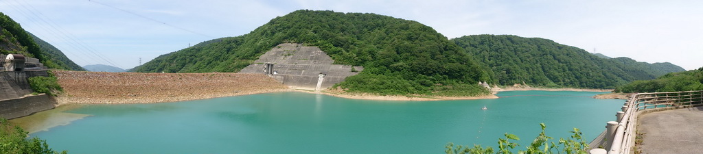 ダム湖を見渡せる場所から、ケータイのパノラマ写真機能を使って撮影。