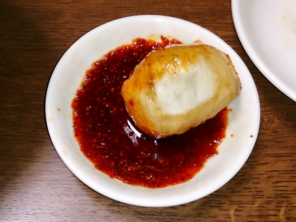こんな風に、ラー油たっぷりのたれにつけて