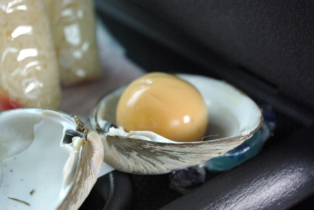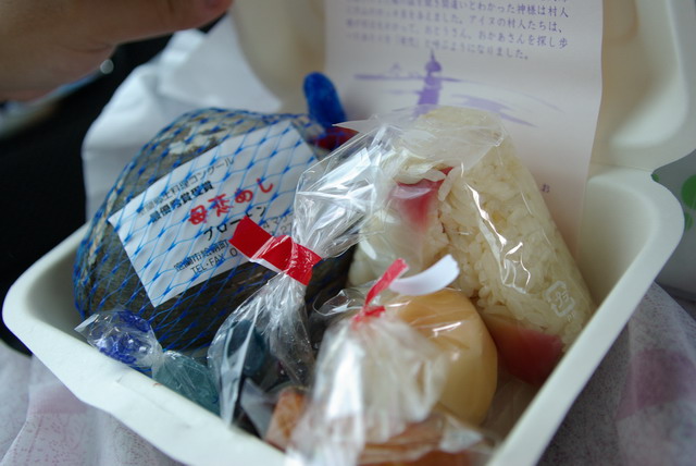 ピンクを基調とした風呂敷に包まれている。それを解くとそこには二枚貝の貝殻を思い起こさせるような容器が。期待をしながらふたを開けるとそこにはデーンとホッキの貝殻が地座している。青のネットに入っているので、コレはもしかしたら漁の網をイメージしているのかな?いいねぇ、こういう演出。で、ホッキの炊き込みご飯のおにぎり。生のホッキはグレーがかっているのだが、加熱するとキレイな赤みがかって更に美味そう!おにぎりはホッキの貝殻の中に入って全部で2コ。おかずは燻製卵・スモークチーズ・ナスの漬け物。燻製卵とナスの漬け物はホッキ貝の貝殻を皿に見立てて盛りつける。