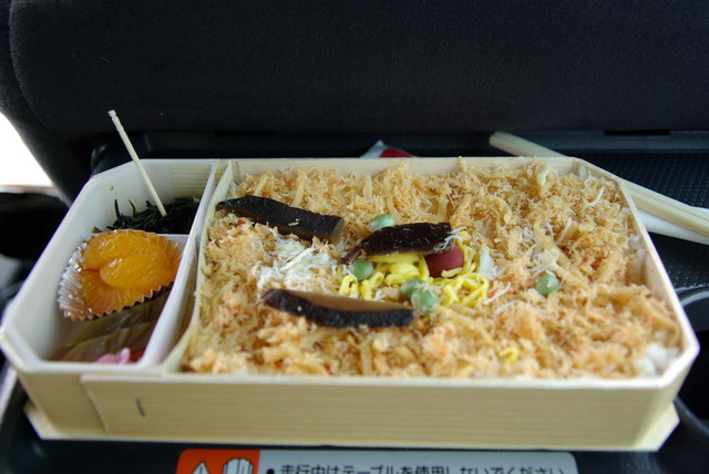 ふたを開けるとびっくり!白いご飯の上にビッシリ敷き詰められたほぐしたカニの身。色が付いているのと付いていないのがあるので、きっと味が違うんだろう。更に上に載っている細長く切った椎茸・グリーンピース・錦糸卵・梅干しが、単調な色合いにならないよう鮮やかな彩りを添えている。容器のほとんどをカニのほぐした身が覆ったご飯で占められているので、ボリュームは言うこと無し。