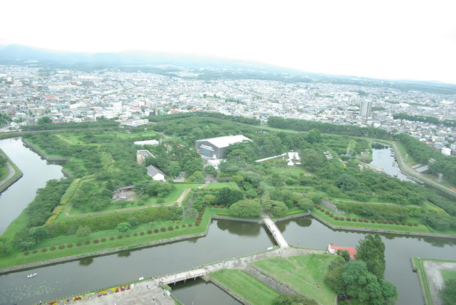 五稜郭タワーだ。早速中に入ってみる。エレベーターホールのあるフロアは人でごった返していたけど、実際にエレベーターに乗る人はそんなに多くない。窓口でケータイのクーポン券を提示して、割引料金で入場料を払う。そしていよいよエレベーターで展望台へ。数分後、目の前には見覚えのあるかなり有名なあの景色が広がる。