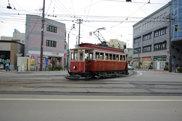 さて、ラーメンを食べてお腹がいっぱいになったところで十字街電停まで戻ると、車体の軋み音を響かせながら走る市電を発見。ハイカラ號だった。