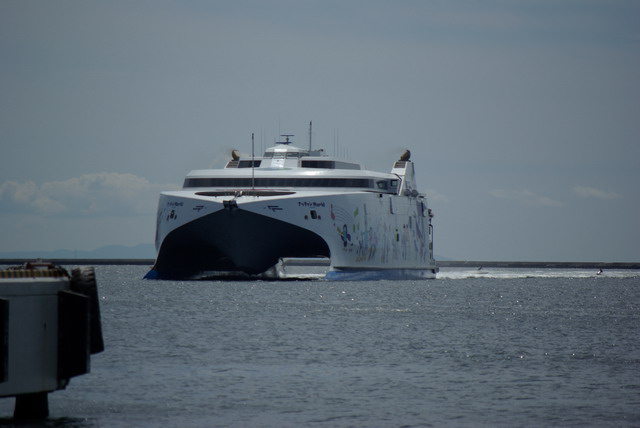 東日本フェリーが誇る最新鋭の高速カーフェリー、ナッチャンワールドだ。横から見るとこんな感じ。