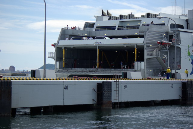 フェリーターミナルに入る際、俺たちは入場ゲートで自動チェックインを済ませる必要がある。引き替えチケットをバーコードリーダーにかざすだけでチェックイン完了。そしてチェックイン機から、本チャンのチケットが出てくるのである。あとは駐車場の指定された場所に停め、順番通りに乗員全員車に乗車したまま乗船する手順になっている。