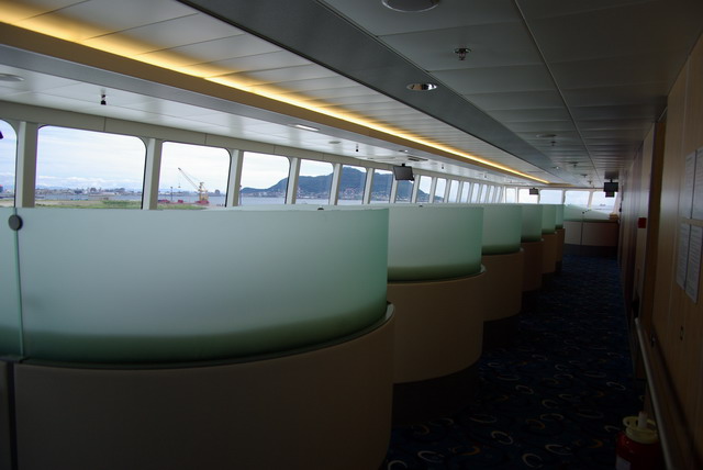 さて、ひとしきり船内を探検したら自分の席に戻る。さすがエグゼクティブフロア。エコノミーの上のフロアなので、非常に静かだ。チケットを持たない乗客の入室を禁じられているおかげで逆に静かすぎる。はると話すにしてもヒソヒソ話になってしまうほどだ。