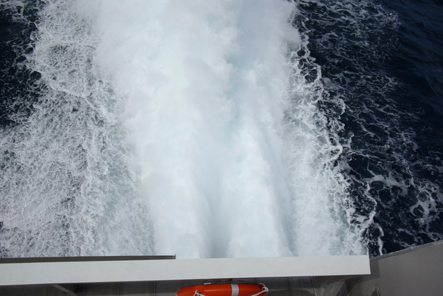 ところで飲み物はおかわり自由だけど、2杯目以降はエグゼクティブフロア専用のカウンターまで取りに行くことになる。ちょっと面倒だ。結局2杯しか飲まなかった。それもそのはず。通常船で4時間位かかるのだが、この船は1時間45分~2時間で函館と青森を結んでいる。そんなにのどなんて渇くわけ無い。船って遅いように感じるが、これが意外と速いのだ。デッキから海を眺めていると、結構なスピードで海面を滑っているのが分かる。新潟から乗った新日本海フェリーのフェリーあざれあの航海速力22ノットあまりだけど、ナッチャンワールドは更に速い36ノットも出ている。出航した後後部デッキへはると一緒に出てみた。