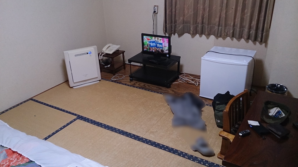 宿は甲府駅そばの宿。駅近くなのに駐車場無料なのが嬉しい。部屋は和室シングルを予約。チェックインする時に、フロントのおばちゃんとちょっとだけ話をする。今晩は満室との事。昨晩webを見た限りでは部屋空いていたのに。飛び込み客が多いのかな?ちなみに部屋はこんな感じです。一部画像を加工しているのは、脱ぎ散らかした衣類が映っているからです。決して、エロ・グロが写っている訳ではありませんので、どうかお気になさらず。
