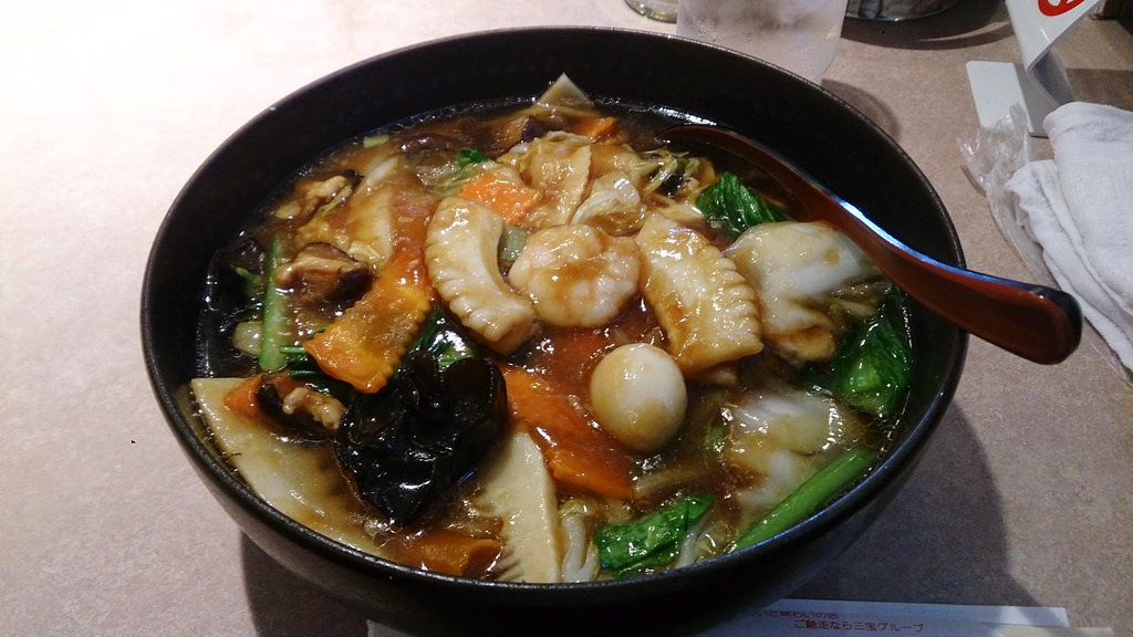 熱々の餡に絡んだ白菜・椎茸・人参・竹の子・キクラゲ・鶏肉・うずらの卵が美味い!