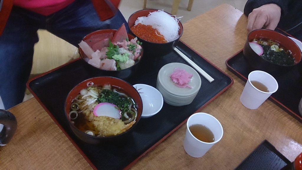 左がマグロづくし丼(ネギトロ・ビントロ・赤身)で酢飯2合弱くらい、右がイクラ丼(3割ぐらいイクラであとは刺身で使うツマ)で普通のご飯1合半くらい、真ん中上がエビ天がのっかってうどん半玉くらいかなぁ。