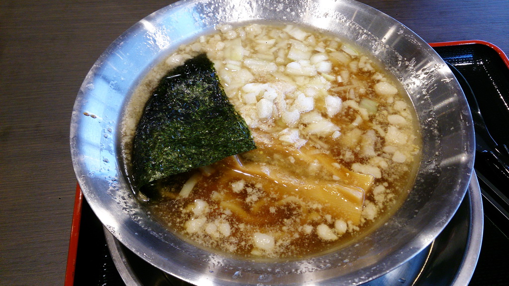 で、肝心の中身なんだけど、麺は縮れた太麺で、濃いめの魚介系醤油スープがよく絡む。そのスープには背脂が浮いており、一見コッテリに見えるけど実際は想像以上にあっさりしている。タマネギのみじん切りがトッピングされているんだけど、それがあっさりをアシストしているのだろう。ガッツリ食べたい方は一緒にライスも頼んじゃうと思う。ジューシーな豚バラチャーシューがご飯をかき込むのを加速させるのは間違いなし。