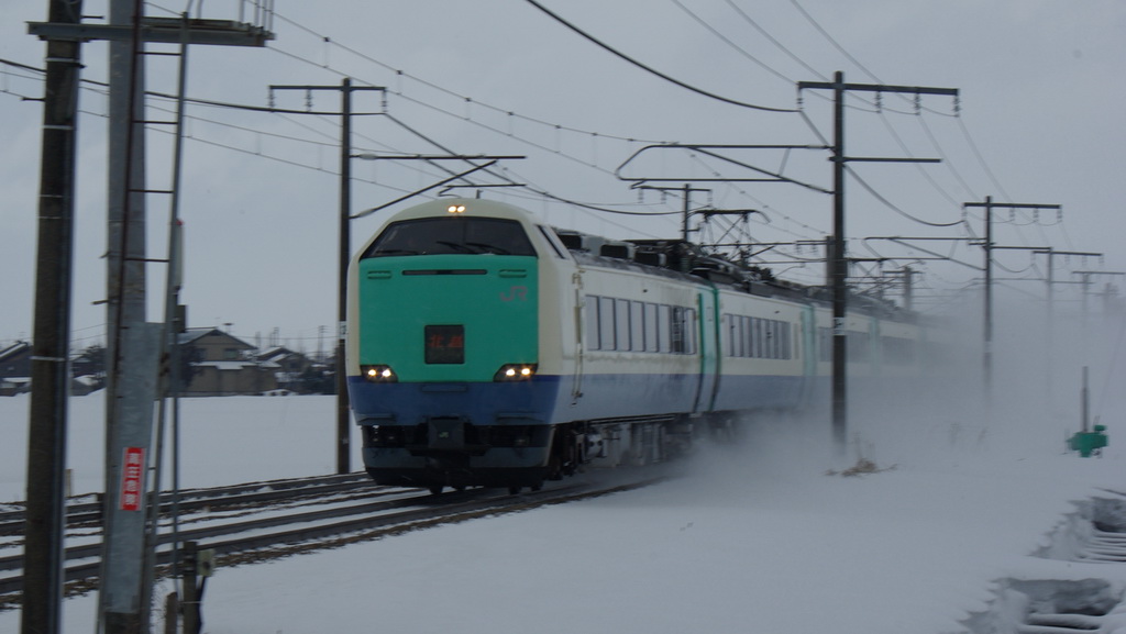 雪煙を舞い上がらせながら爆走する、特急北越4号金沢行。