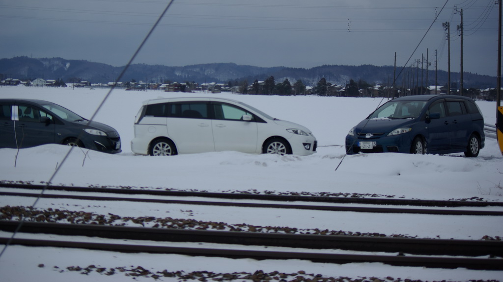 踏切脇の雪で覆われた農道にプレを突っ込んで、なんとか3台分の駐車スペースを確保。