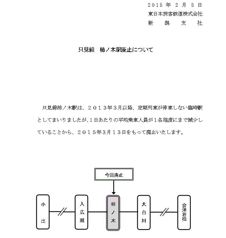 特にこの柿ノ木駅と、同じ只見線の薮神駅は、やんばるが大いに気に入っている駅なので、そのうちの一つが無くなってしまうのはとても寂しい。鉄道ファン目線からみれば廃止なんてまかり成らん!!と声を大にして言いたいんだけど、鉄道運営はボランティアじゃないし立派な営利活動なので、不採算だから廃止というのも致し方ない。なんせ、1日平均利用者が1人じゃね・・・。