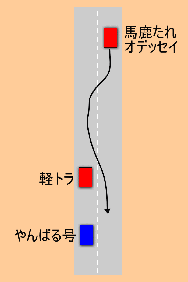 突然対向車線から、馬鹿たれなオデッセイ(以降馬鹿オデと略)が、なんとこっちの車線に入ってきたんですよ。