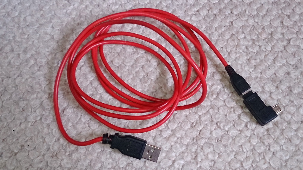 L型microUSBコネクタ → 三月兎で購入。Xperia ZのmicroUSB端子は左側に付いていて、普通のコネクタだと出っ張っちゃってすんごいジャマ。なにかの拍子にいつの間にかコネクタが抜けちゃっていることもしばしば。