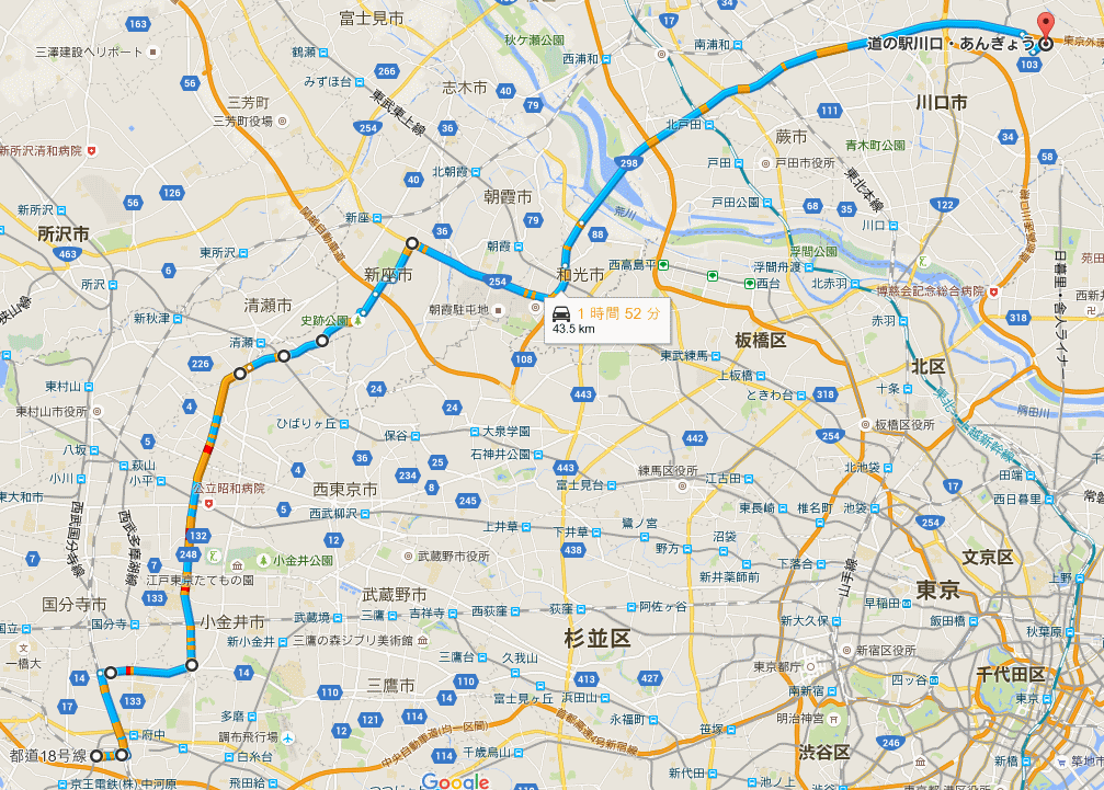 以前東京府中と埼玉朝霞に住んでいたので、両市を結ぶルートは完全に頭の中に入っている。なのでそこから先の川口までは、そんなに大した距離じゃないだろう。しかも、所々新しい道が出来て、以前と比べて大分走りやすくなっているので、所要時間はまぁ2時間くらいだろうと予想。
