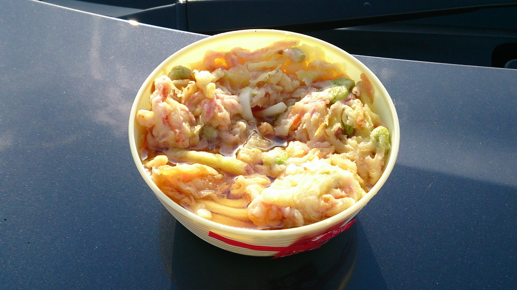 枝豆・タマネギ・人参・紅生姜等が入ったかき揚げが載ったうどん。