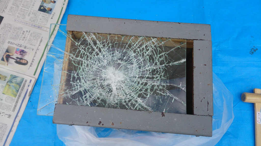 破壊してみませんか?なんとも刺激的でアウトローな誘い文句に誘われて、言われるがままに防具一式(ゴムを張ってある軍手・保護めがね)を装着して、木のハンマーを一振り!