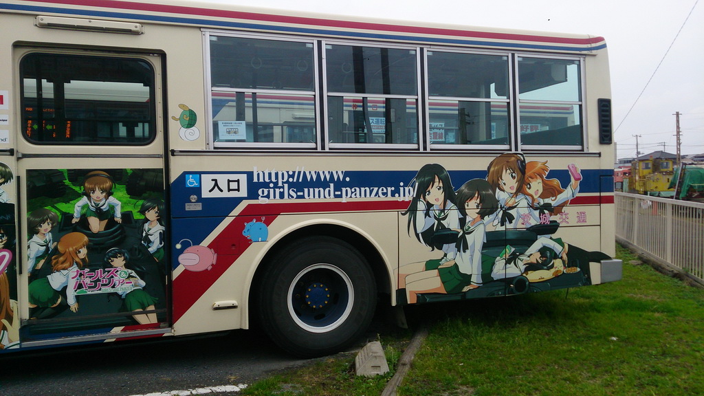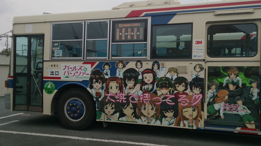 ガルパンラッピングバス!すぐに駅に入り、ホームからバスを撮影。