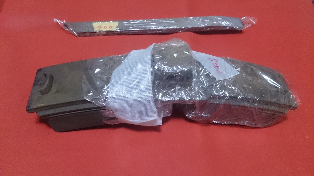 下のは、HK100形の制動子。いわゆるブレーキシュー(使用済み500円)
