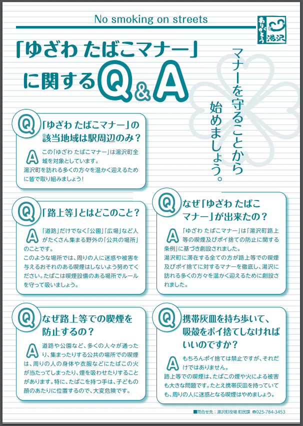 湯沢町 たばこマナー(湯沢町公式ページ)喫煙環境が段々と厳しくなっていくご時世ですが、喫煙する方しない方、お互い楽しいオフ会になるように心掛けましょう。