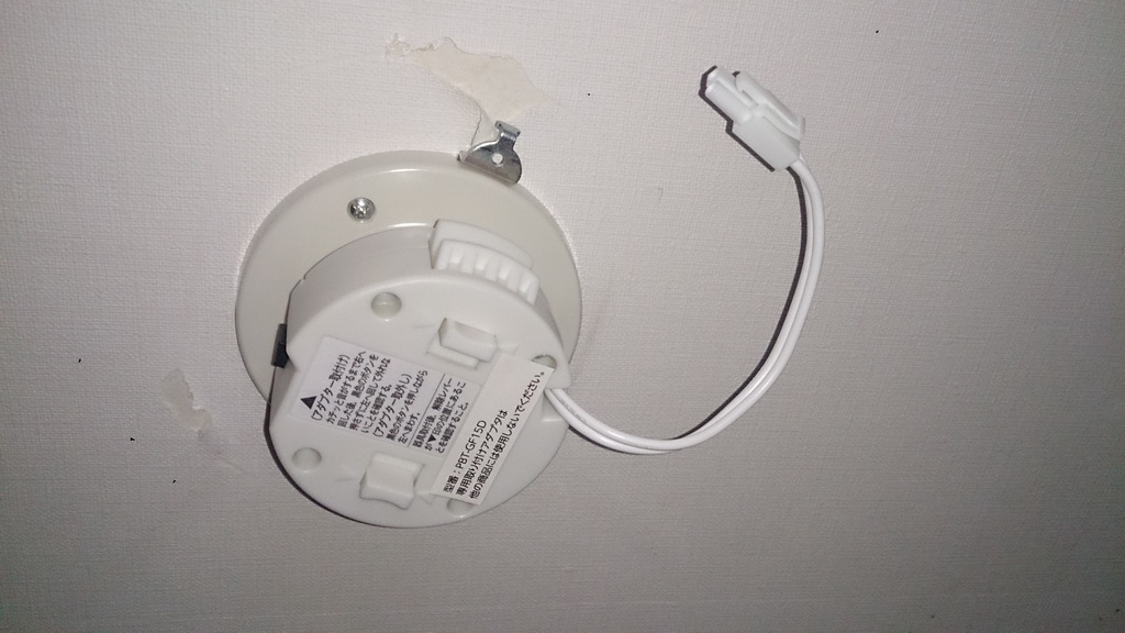 元々取り付けてあった照明器具が、付属の金具で天井に固定されていていたので、配線はこんな感じで宙ぶらりんでもOKなんだけど、このままじゃ同じメーカーのしか取り付けられないんじゃないか?