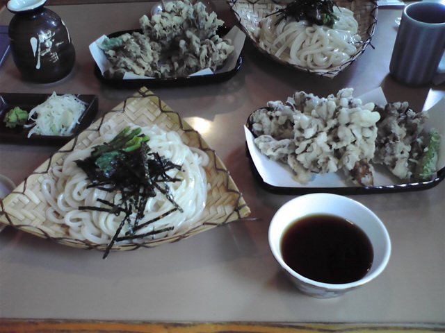 建物入口すぐ脇にお土産専門の窓口があって、中に入らなくてもうどんとつゆを買うことが出来る。俺たちはもちろんうどんを食べにきたので建物の中に入っていく。入るとすぐに窓際の明るい席に案内される。この店はうどんと天ぷらがメインなので、うどんの盛りと天ぷらの数を選ぶだけなのだ。俺は迷うことなくうどん大盛り(俺から言わせれば普通盛りレベル)と、天ぷらは女性の握り拳ほどもある大きさの舞茸の天ぷらが3個付いているセットをチョイス。【はる】も同じモノを注文。うどんが出来るまでの間【はる】と話をしながら待っていると、隣の席に夫婦がやってきた。その夫婦とお店の人との会話の端々から、どうやら札所巡りをやっているとかで、三重県からやってきたという。高速1000円乗り放題効果はこんなところにも出ているなぁ。