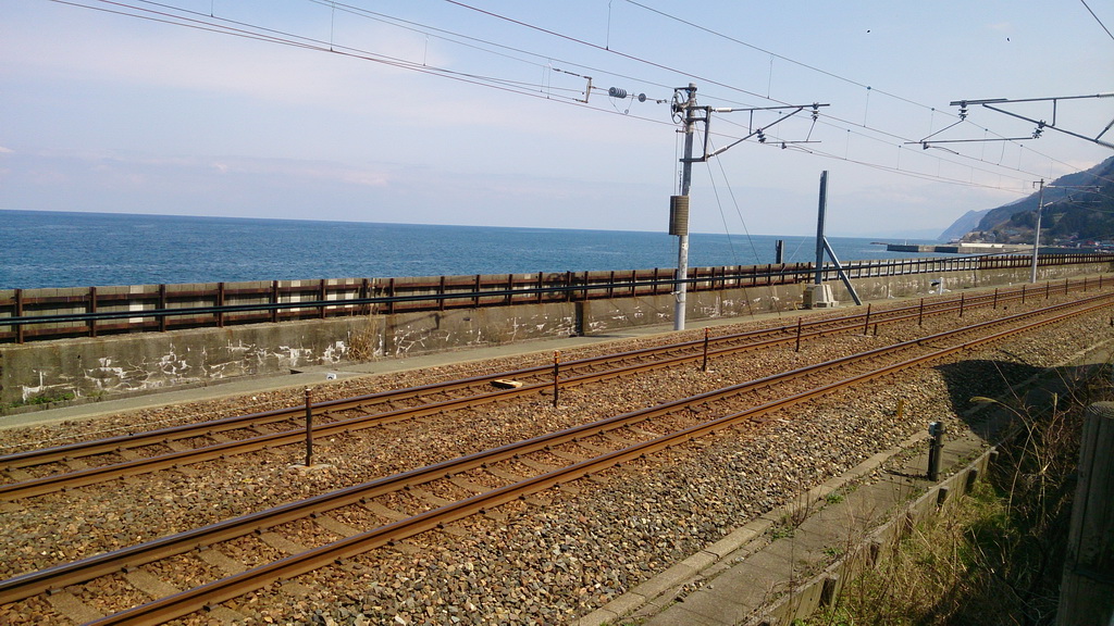 えちごトキめき鉄道日本海ひすいライン(旧北陸本線)の谷浜駅を横目に