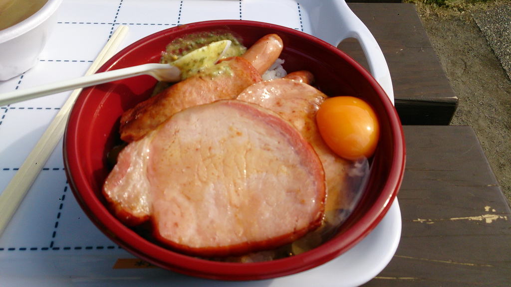 香ばしく焼かれた厚切りハムやらベーコンやらソーセージやらが、どーんとご飯の上に乗っています。見ただけでヨダレもんですよ(笑)
