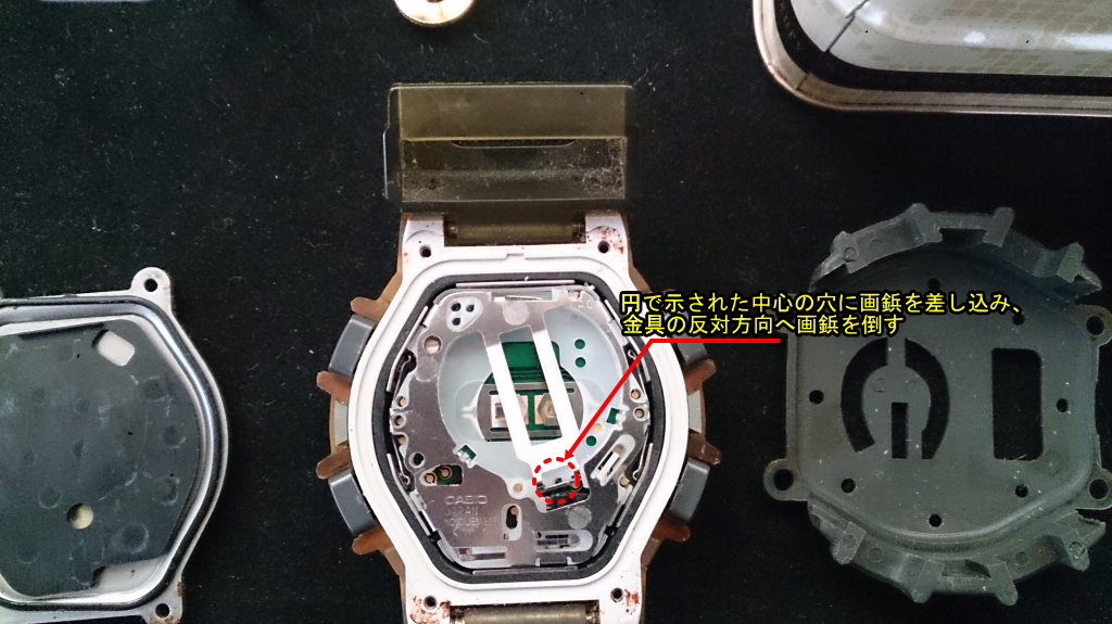 画鋲の針で、電池を固定している金具の留め具を、てこの原理で外します。