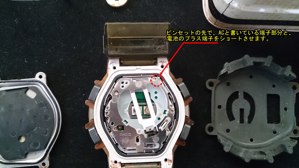 液晶の表示が正しくなっていることを確認したら、小さいバネを元の位置へ戻したら、蓋を閉めます。防水パッキンがずれないように注意してくださいね。