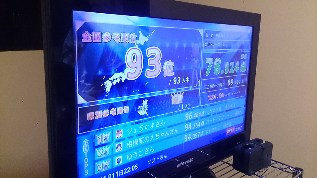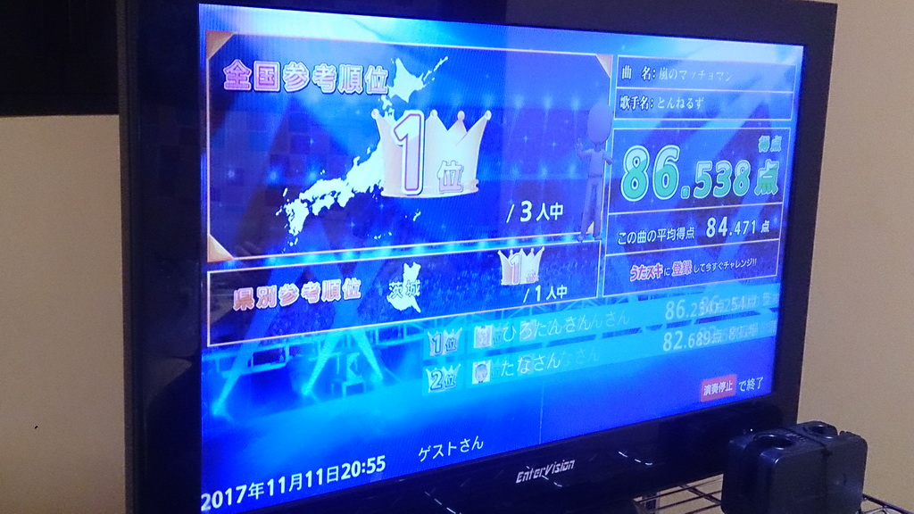 なんか歌えそうで盛り上がれる歌が無いかと、歌本ならぬデンモクならぬタブレットで検索してみた結果、とんねるずの嵐のマッチョマンを歌うことに。お約束の全国ランキングに参加したので、その結果は・・・