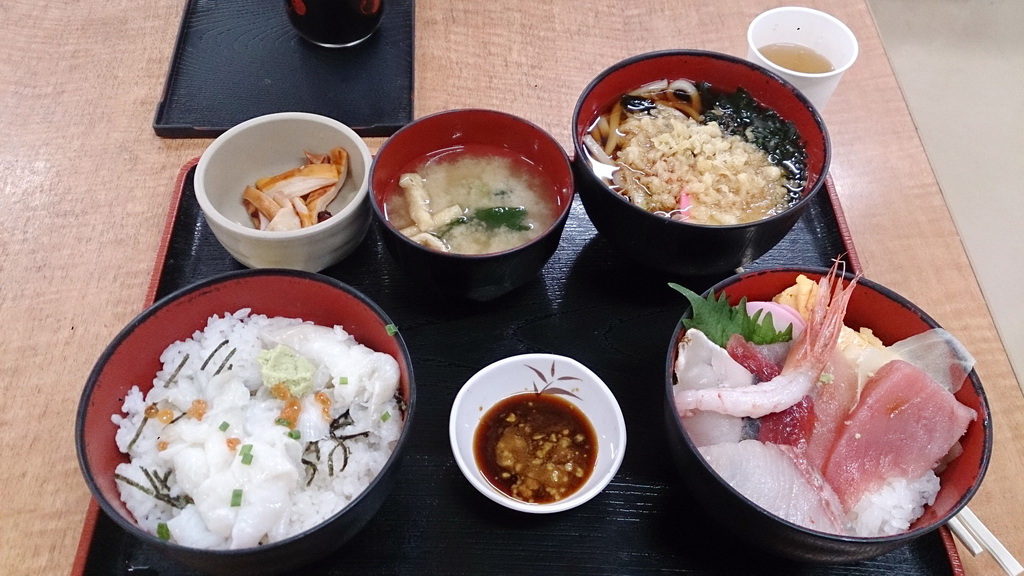 内容はと言うと、えんがわ丼と海鮮丼のツートップに、わかめうどんに天かすトッピング、イカの酢漬けと味噌汁が付いて破格の880円。大盛にしなくても十分満足なボリュームでした。